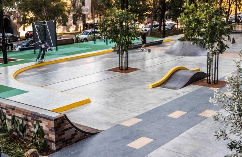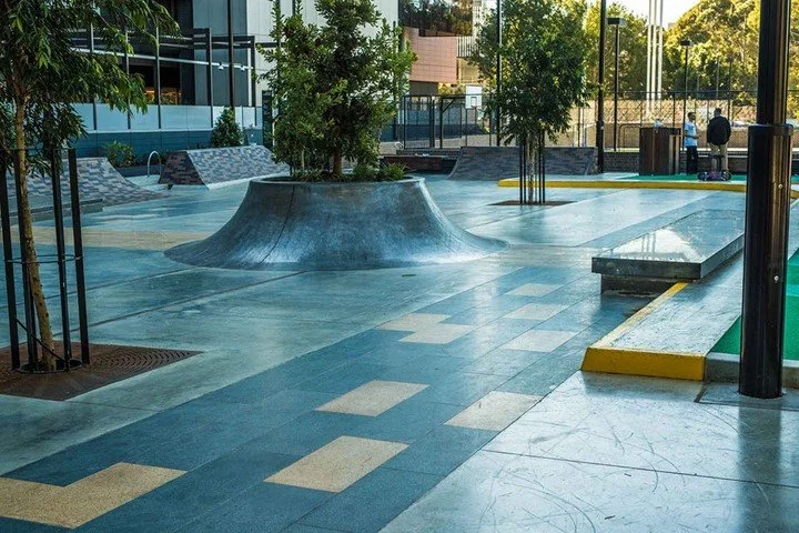 A következő helyszín az ausztráliai Sidney és ez a cuki kis plaza, a South Eveleigh Skatepark.Sok jó elem kis helyen is elfér. Ipari talaj, remek elrendezés, mindig ott van “útban” valami, ahol tényleg kell, hogy legyen. Kellemes környezet, árnyék és kerítés. Náluk is kicsik a lépcsők, hogy meglegyen a flow, az utcán sem dobálja senki a nagy lépcsőket menet közben. Az összes csúszásra alkalmas elem kemény és minőségi anyag. Van lankás és extrém hajlásszög is.Teljesen jó ötlet más felületeket is használni, ez mind hozzájárul az utca érzéshez, ahol azért nem mindig sima felületű minden. A klinker tégla csúszik is, zakatol is.Vulkán középen és sárgára kent, ideálisan döntött padka slappy-khez.Madártávlatból így néz ki, a ráadásul, városi környezetben kialakított skatepark. Az átlag embernek valószínűleg fel sem tűnik, hogy egy skatepark mellett sétál el, mert közparkként illeszkedik be a környezetbe.